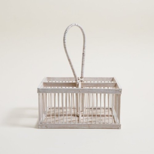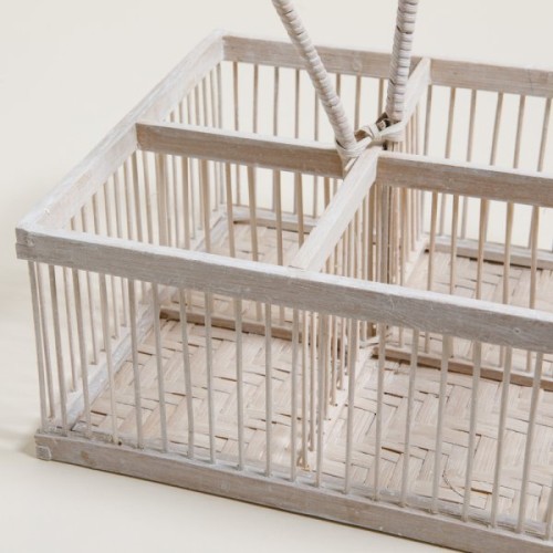 Organizador con 4 divisiones combinado en madera y fibra natural de color blanco.